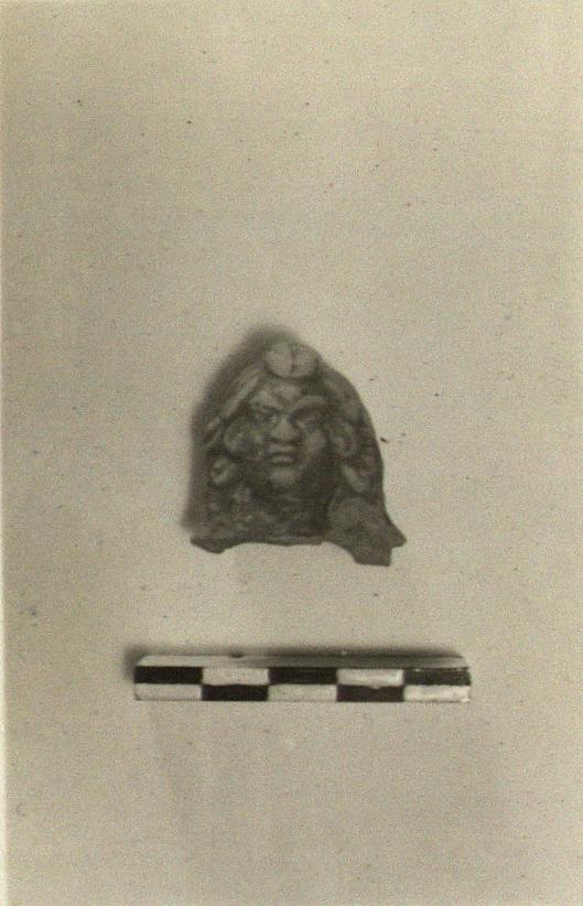 | Description: | Broken away at neck. Head of child with curly hair and a braid from front to back across the top of the head. A finished hole at the back of the neck. Dull red glaze, inside and out. Most probably from a lamp. Late Roman. ADDENDA: C. Grandjouan: plastic lamp. | |
