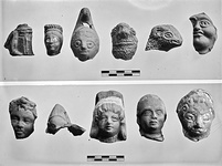 | Description: | Front part of head and neck of female (?) figurine. Round face, wide open eyes with pupils marked; broad flattened nose; small mouth with corners turned down; puffy cheeks; double chin; fat wrinkled neck; slight remains of hair above a very high, receding brow. Mold made; traces of red paint. Pinkish clay. | |