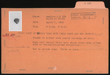 | Description: | Front part of head with broad face and top knot (?). Breaks on either side nearly converge at chin. High roll behind front hair which waves down either side of centrally-parted projection. White paint on eyes. Red to yellow clay. ADDENDA: Same mold as L 5009. | |
