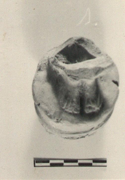 | Description: | Preserved is the edge of the garment, and the bare feet of a figure standing on a low oval base, with plain mouldings above and below. Traces of color (?) Pale buff clay. | |