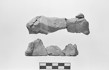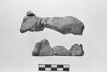 | Description: | Fragment a) head and neck. Fragment b) base and two feet. Fragment c) rump and upper part of left hind leg. ADDENDA: Hollow above, back round and between legs. Upper part (fragment a) and lower part (fragment b) put together, strenghtened with plaster. | |