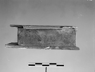 | Description: | First interpretation: shallow rectangular box, open at the back. Fragments missing. Broad flat projecting base and top. Traces of an object that stood on top. White color and traces of pale blue. ADDENDA: Traces of the figure that stood on top. | |