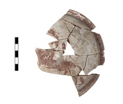 | Description: | Fragmentary shield. Part of the right side and center of the shield preserved, with remains of arm strap on back. High convex shape with sharply offset rim. Remains of winged horse with rider (?) left: horse and margin in red, rider, exergue and part of backround blue. The rider has a red helmet with flying crest. Both red and blue pigment laid over white ground; and the blue of the rider 's body over the red of the horse. Buff clay. Cf. Chase (1902), HSCP 13 , p. 110. | |