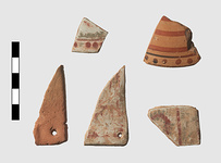 | Description: | Fragment from edge of plaque. At edge of plaque, border of two narrow red stripes with blue between. Within, bit of sharply twisting snake, red outlined with blue dots. Red and blue pigment on white ground. Back unpainted. Buff clay. | |