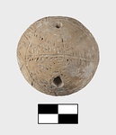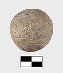 | Description: | Pierced horizontally near top. It has incised filled decoration. Pattern mostly in seam motif: lines bordered by rows of dots. Zone round center in seam line, zigzag. Four seam lines alternating with four plain rows of dots radiate from above and below to meet borders of zone. Traces of blue paint (?). Buff clay. Cf. MC 1109 and MC 1110. | |
