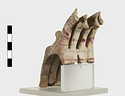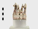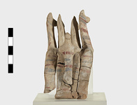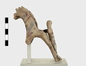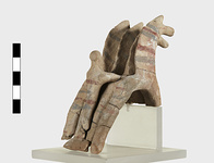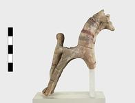 | Description: | Four horses with driver figurine. Forelegs missing; mended from many fragments. The driver leans against the long hind legs of the central horses and rests his hands on their backs. The driver stands on a narrow bar against the hind legs of the horses, on the neck of which are blue lines on the inner horses. Blue, red and white stripes across horses and man alike. Ash buff clay. Cf. Pfuhl (1923), I, fig. 58, for MacMillan lekythos, which has stenographic representation of a chariot. See also JdI 14 (1899), p. 122, fig. 26, for similar pieces found in Eleusis, on Athenian Akropolis and at Menidi. Another piece in the Munich Pinakothek (no. 5602). | |