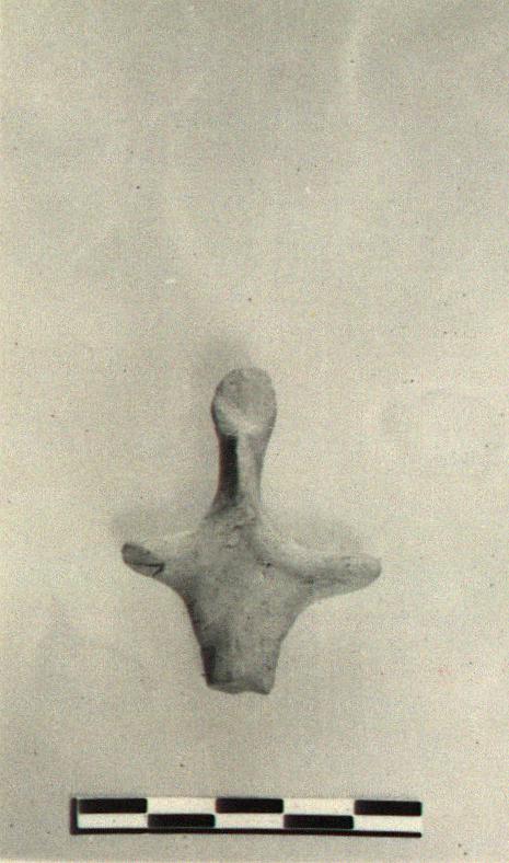 | Description: | Broken away below. Small votive figure with pinched face and stubby outstreched arms. Traces of white paint. Buff clay. Primitive. | |