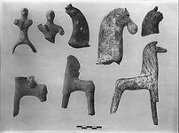 | Description: | Head and part of large horse. Traces of a collar. From the breakage at the bottom of the neck, the body may have been hollow. Traces of red paint with three white brush strokes on left side of neck. In size and technique, this differs slightly from T 196. Pinkish buff clay. | |