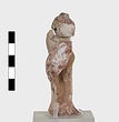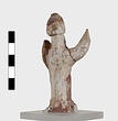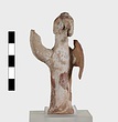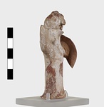 | Description: | Columnar type with spreading flattened base. Left arm missing. Mended from two pieces (body and right arm). Bearded, helmeted man. Right arm raised as for a spear; a shield probably hung on his left arm. The bit of shield, restored in the photograph as hanging on the arm, may have come from the figure T 193. Pointed bird-like face with red eye beneath very large helmet, painted red on top. Painted red and white. Pinkish buff clay, dark. Cf. Myres (1914), Censola Collection, p. 344, no. 2099. | |