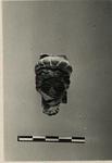| Description: | Broken behind. Face framed by heavily waved hair surmounted by a thick fillet or cap, a projection at the back above (for handle ?). Eyes pierced. Considerable remains of white over, on headdress and neck. Light red to buff clay, with thick dull red wash. | |