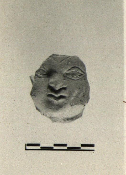| Description: | First interpretation: child 's face. Fat woman 's face, broken off at neck and behind. Traces of red glaze and of white in eyes. Red clay. | |