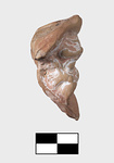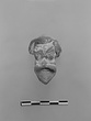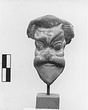 | Description: | Complete comic mask. Long pointed beard; cheeks bulging at corners of mouth; blunt nose and popping eyes; irregularly arched eyebrows. Pierced at either side at point where ear should be, for suspension, and a third hole through the flat top. Pink paint added over white on face and hair; red on lips and beard. Pink to buff clay. | |