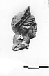 | Description: | Broken off at base of neck. The head is tipped slightly to the figure 's right; the hair is parted, drawn back from the brows in soft waves and crowned by a high fluted diadem. Strips of clay attached across the back of the neck and terminating towards the front in small twists, might possibly be intended to represent some adornment, possibly curls. Remains of white over, with traces of red over. Greenish-buff clay. ADDENDA: Back of head unworked. Retouching. Blond clay. | |