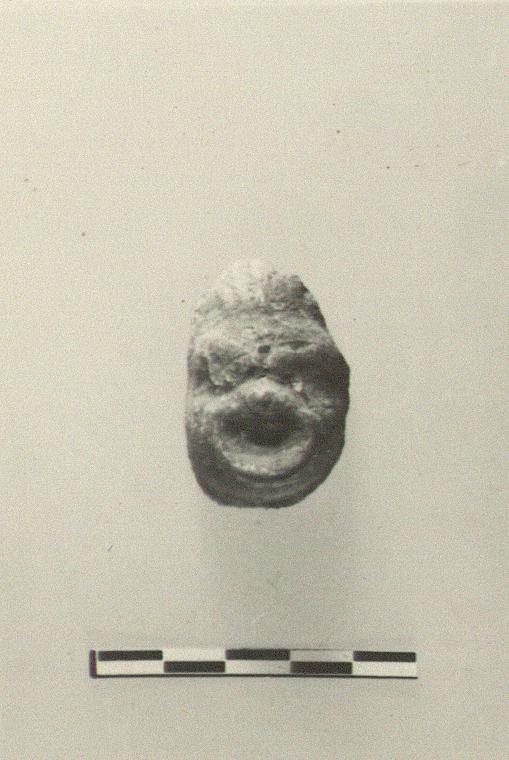 | Description: | Face preserved only from a comic mask. Red paint over white for face; white for hair or headdress and probably for eyes which are outlined in black. Brownish-buff clay. | |