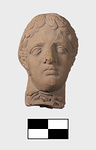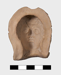 | Description: | Chip missing from exterior of mould; otherwise complete. Head with rather melancholy expression, tipped slightly to the figure 's right. The hair worn in short curling locks. The positive shows a very carefully modelled head. Fine pinkish-buff clay. ADDENDA: Bronze style-impression (?). Pinched wrongly. String holes and tabs. Cracked inside. Eyes slaut down convex corners. Cf. Dimitrakopoulou (2024), no. A230, pp. 260-261, fig. 57. | |