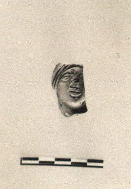 | Description: | Left side of face and top of head broken away; back missing; broken near base of neck. Broad nose, slanting eyes, hair combed down straight on sides from central part. Crude modelling; gouged style. Traces of red paint on face, of black on hair and of white on eyes. Reddish-brown clay. | |