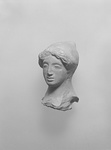 | Description: | Broken off at bottom of neck, and chipped at back. The hair wavy around the face, at the back enveloped in a kerchief which projects in a point. Traces of white. Dark buff clay. | |