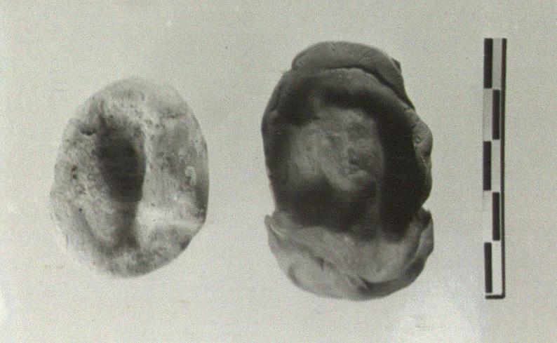 | Description: | Intact mold for front part of head and neck of a figurine. ADDENDA: Mold for female head. Back is dented. Buff clay, worn. | |