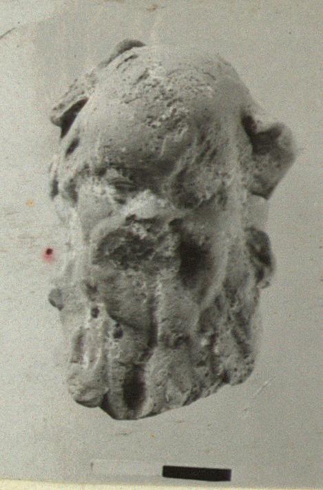 | Description: | Head of a bald bearded satyr. Broken off at neck. Left ear broken off. Very big ears. traces of wreath in front of head, which was turned up (or satyr was squatting and looking forward). Traces of white sizing on face and beard. ADDENDA: Gray-burned buff clay. | |