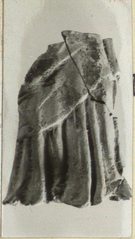 | Description: | Fragment of lower front part of a figure. Broken at top and upper sides. Figure wears a crinkly inner garment and heavier outer one, the latter probably draped over one shoulder. Traces of powder blue paint on both garments. ADDENDA: Piece from upper right of fragment added from sherds. Figure wears chiton and himation. Dark red border on himation and wide pink bands on chiton. Hard buff clay. | |