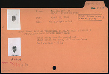 | Description: | Upper front part of rabbit (?). Perforated hole between ears. Mould-made; details gouged out. Light brick red clay, buff at surface. Same mold as T 3354. | |