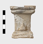 | Description: | Rectangular altar, hollowed at the top; base and crowning mouldings in two degrees. A boukranion in relief on the front; a round hole at the back. Volutes at the top in front. Small fragments missing. Paint over all. Much worn. Cf. Dimitrakopoulou (2024), no. A136, p. 212, fig. 23. | |