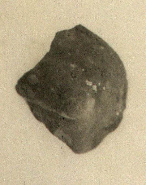 | Description: | Fragment from right half of figurine, showing lower leg of child riding on cock. Front of wing and breast of cock preserved, the feathers indicated. Remains of red and white paint. Pink to buff clay. | |