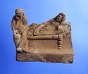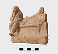 Represented is a group of two figures, a woman on a couch, and a male figure wearing a comic mask seated on the couch at her feet (to the left in the positive). The woman holds a wreath in her right hand. The man in his left.