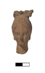 Earrings. Hair indicated by straight and crosswise grooves and ridges.