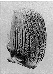 | Description: | Head with hair falling in gouged curls to her neck, crowned with a high headdress decorated front and back with herringbone pattern. Broken off at the neck. Faint traces of red and black paint. Light reddish-brown clay. | |