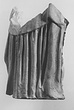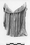 | Description: | Figure draped in chiton and short transparent himation. Mended from three pieces; part of bottom and both sides preserved; back entirely missing. Hard brittle fabric. Traces of white. Pinkish-buff clay. | |