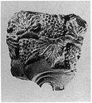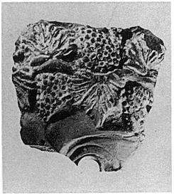 | Description: | Fragment preserved part of left eye and of forehead above with large wreath of grape-leaves and clusters in relief. Broken all around. Light red clay; white on the wreath, with traces of red; traces of pink on the face. | |