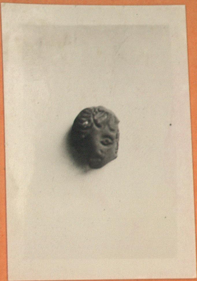 | Description: | Front part of head. The hair is laid in flat waves over the forehead; the hair is indicated, and also the features, by means of coarsely gouged out lines. Mold made; hollow. Pinkish clay. | |