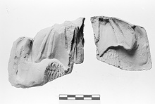 | Description: | Two non-joining fragments, from a mold for a draped figure with curly hair or beard. Perhaps Papposilenos? | |