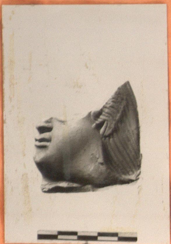 | Description: | Large plump face with heavy fall of straight hair, grooved. Original edge at back of hair. Lower left side of face and hair preserved. Orange-red paint on the face. Buff clay. ADDENDA Cf T 1205, T 1039, T 2057. | |