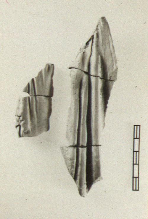 | Description: | Two fragments showing folds. Fragment a) Edge preserved. From a relief? Or Protome? probably hanging drapery only. Fragment b) from center. Soft buff clay, burned gray. | |
