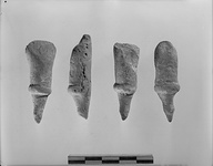 | Description: | Quivers. Three other similar fragments added from sherds. Complete; tapered at bottom for insertion or attachment to a figure. Traces of yelow paint and of pink on fragment b. Tan reddish clay. Possibly chair post? | |