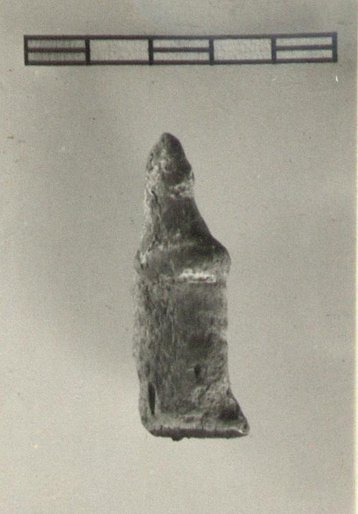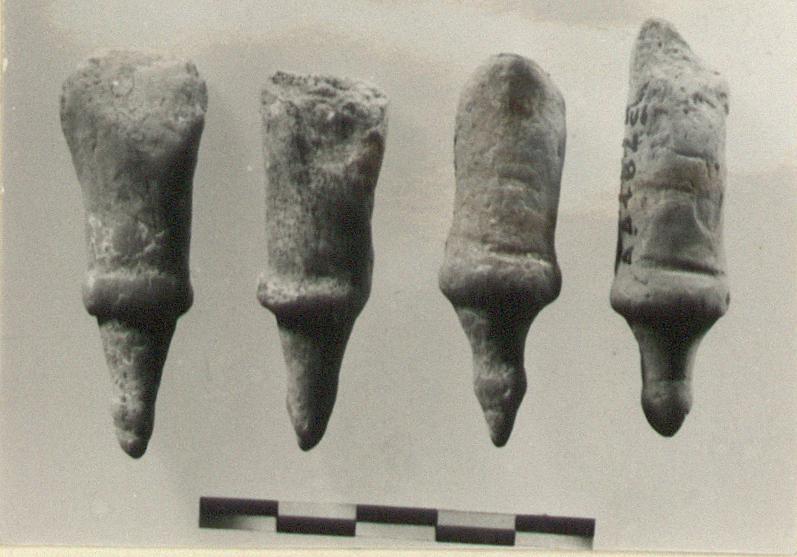 | Description: | Quivers. Three other similar fragments added from sherds. Complete; tapered at bottom for insertion or attachment to a figure. Traces of yelow paint and of pink on fragment b. Tan reddish clay. Possibly chair post? | |
