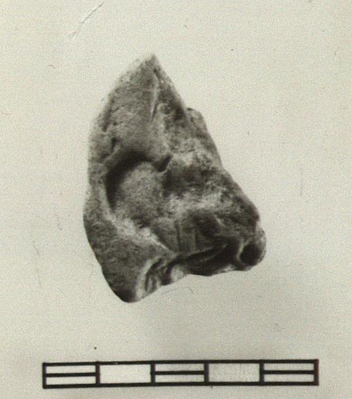 Description:   Fragment from small seated draped woman holding a tympanum (?).