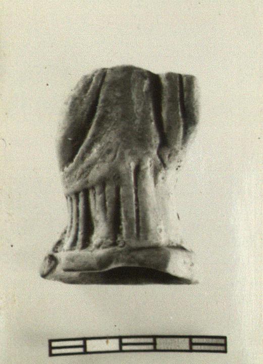 | Description: | Lower part of a draped woman below the waist. Plinth base in with figure. Hollow, with unworked rounded back. White slip. Buff clay. | |