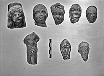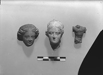 | Description: | Head. The back of the neck and of the head at the left side are broken. The hair is part at the middle, brought down over the ears and rolled towards the back. The hair appears to be bound by a band. The face is small and oval with straight brows, partially opened eyes and nicely shaped straight nose; small mouth; oval chin. Traces of white paint in the hair. Mold made; hollow. Buff clay. | |
