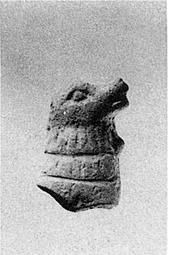 | Description: | One side of head and neck preserved. Dog with ruffly hair on shoulder and neck. Broken off at shoulder and behind. Cf. T 2866. | |