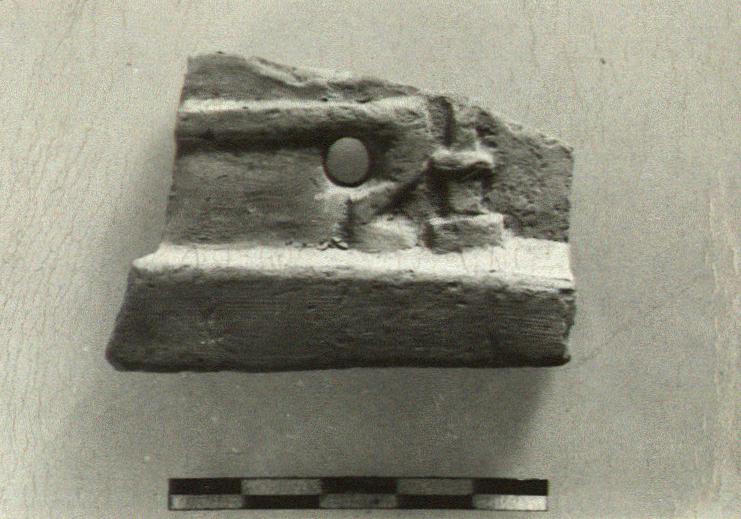 | Description: | Part of bottom, with edge projecting below, and of the right side preserved. On the front, the leg of a table and part of a long bench under it. Attachment hole through the plaque, under the bench. Broken above and at left. | |