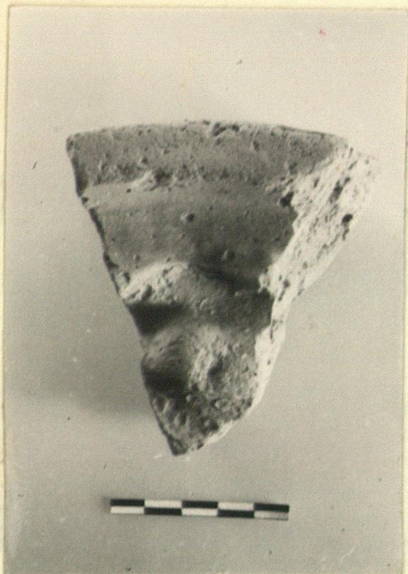 | Description: | Small fragment from edge of a large circular mold preserved. Impression sunk well below top of edge. Part of a loop shaped impression in which are traces of scales: snake (?). Coarse pale buff clay with red grits. | |