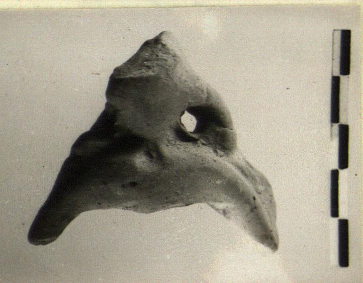| Description: | Fragment of tragic mask. The end of the nose with pierced nostrils and the upper lip preserved. Gaping mouth. Red-buff clay. | |