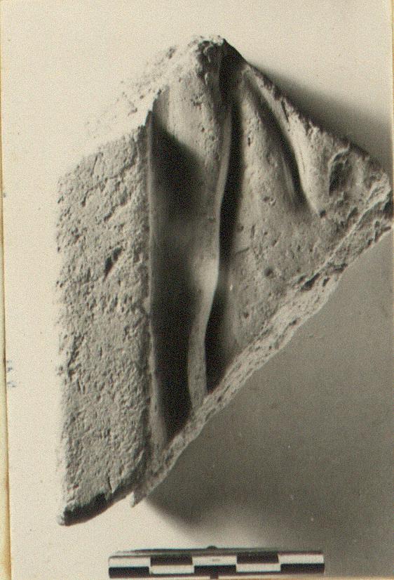 | Description: | Front, back, side (probably right), and frame at front of same side preserved, otherwise broken. Drapery (?) in relief on a large, flat rectangular plaque. Coarse, gritty clay, buff at the surface, darker inside. | |
