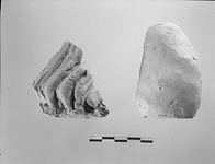 | Description: | First interpretation: fragment from figurine. Lower edge of flowing drapery. Finished edge preserved at bottom and along part of left side of fragment. Heavy careless folds. Pink to buff clay. ADDENDA: The ends of drapery bent back. Cf. T 292. | |