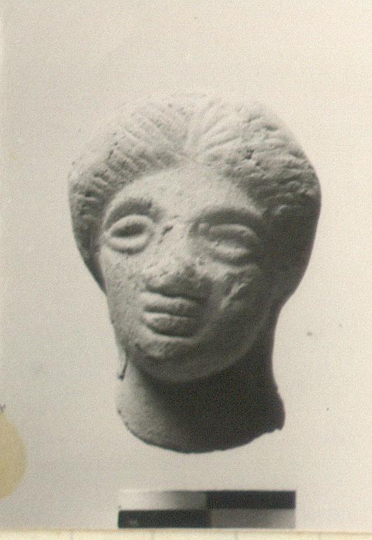 Description:   Head with hair parted in center but combed back; edges of headdress on break at back. Very thick lips and broad nose. Note marks on left cheek.