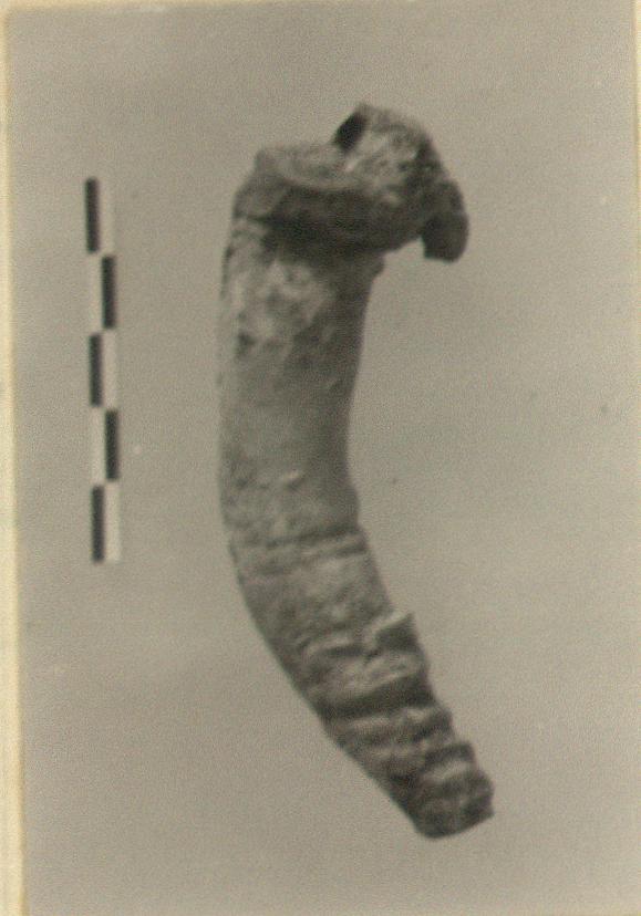 | Description: | A large cornucopia with a band of leaves near the bottom. The back flattened. Traces of pink and yellow over white. Buff clay, reddish at break. | |