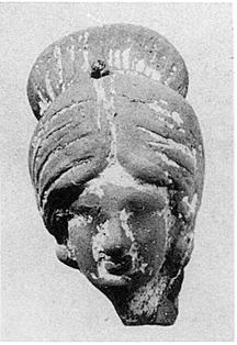 | Description: | Large female head, broken off across neck. Hair parted at center and carried down over ears. At back of head the hair upswept in a fan-like projection, pierced for suspension. Earrings. Ample remains of white engobe, with a few faint traces of yellow over it. Micaceous red clay. | |